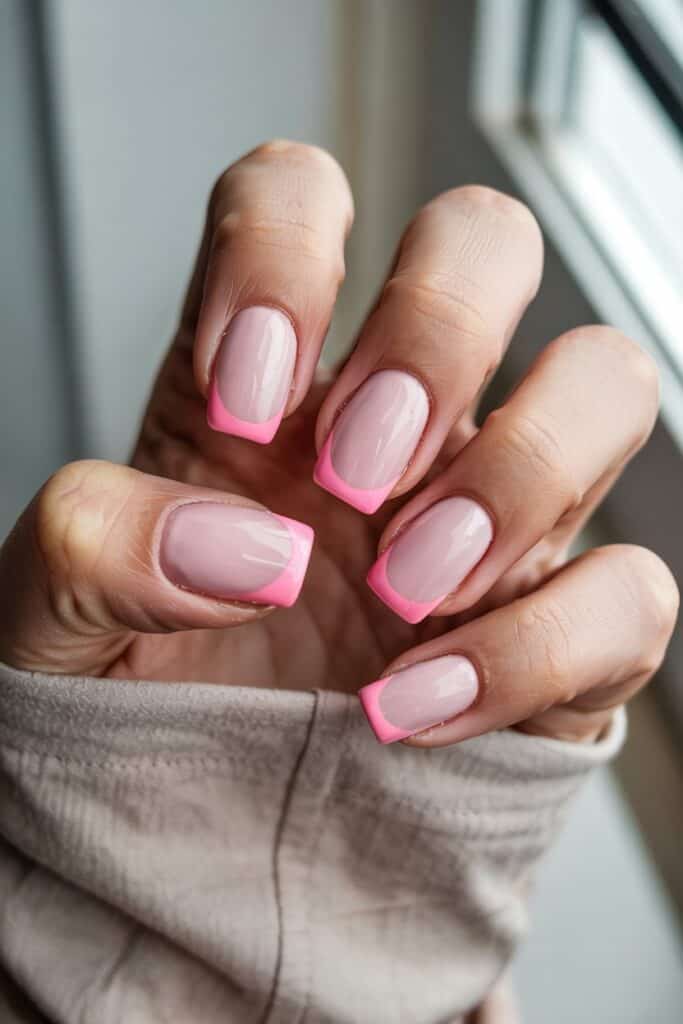 French tips with rosy pink tips instead of white feel playful yet classy. Use a nude or beige base for contrast.