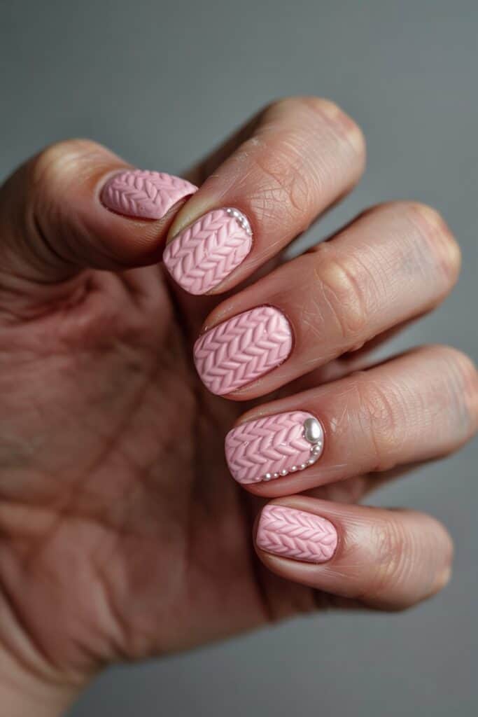 Use a 3D gel technique to create sweater-like textures over pink nails. Think knit patterns and cozy vibes.