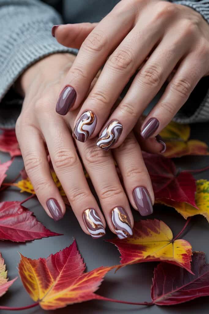 Swirl mauve pink over a nude base for movement and depth. Add thin white or brown swirls for more dimension.