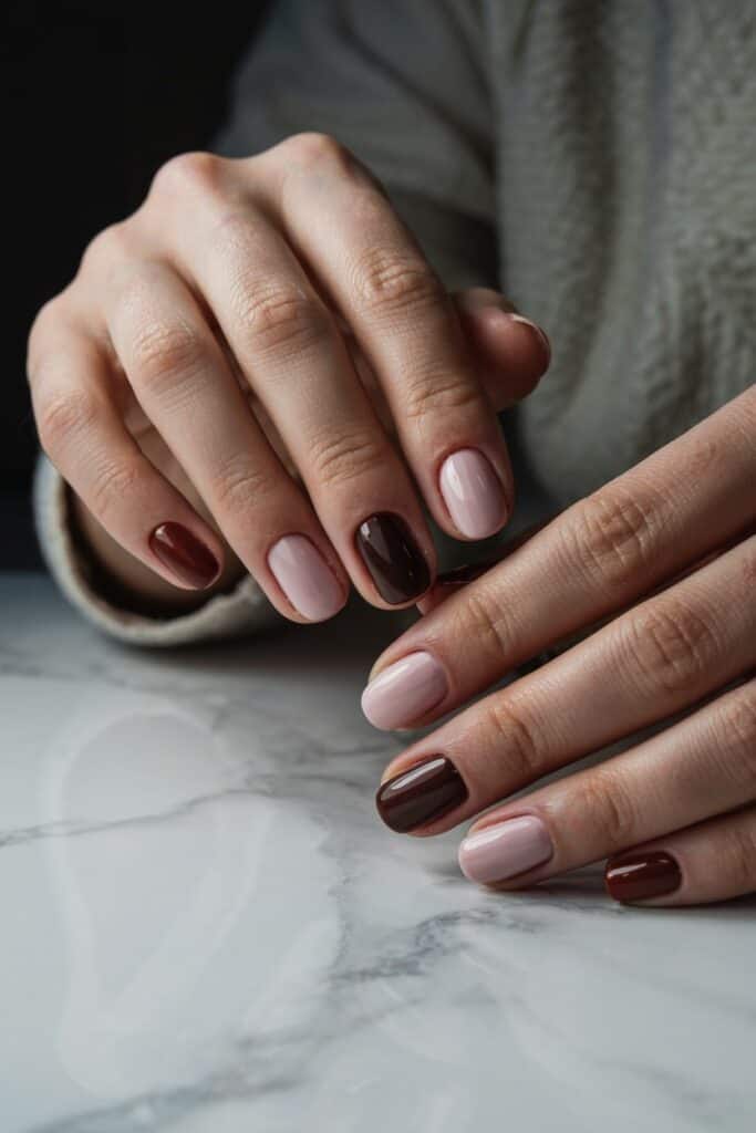 Alternate soft pink with warm chocolate brown for a seasonal two-tone look. The contrast feels cozy and modern.