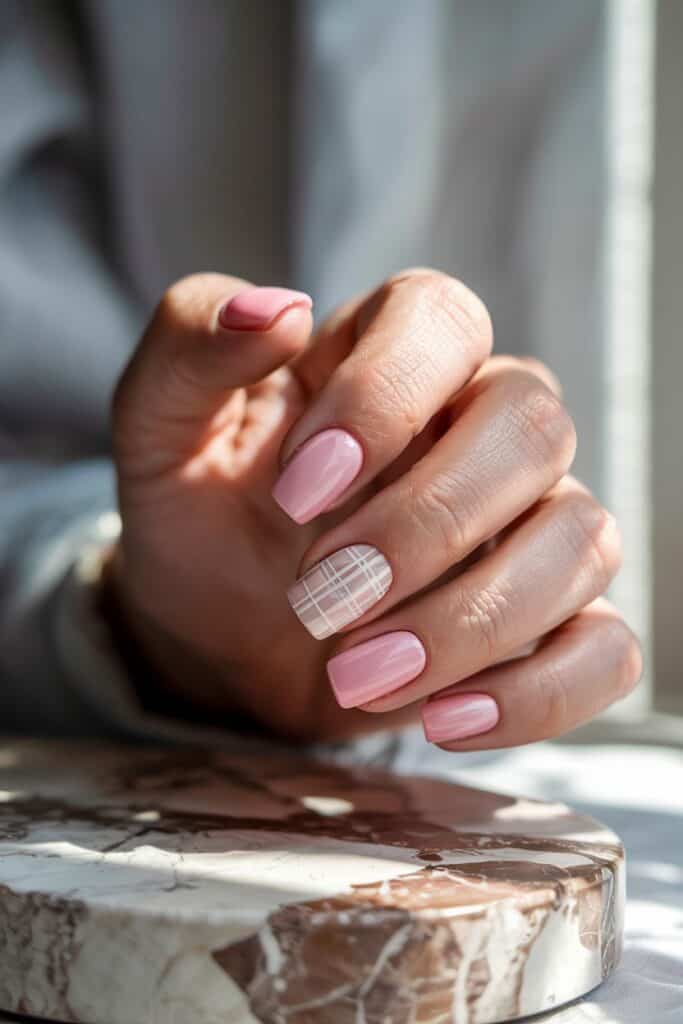Paint most nails pink, then add a plaid accent nail with white and beige stripes. The effect feels like your favorite fall scarf.