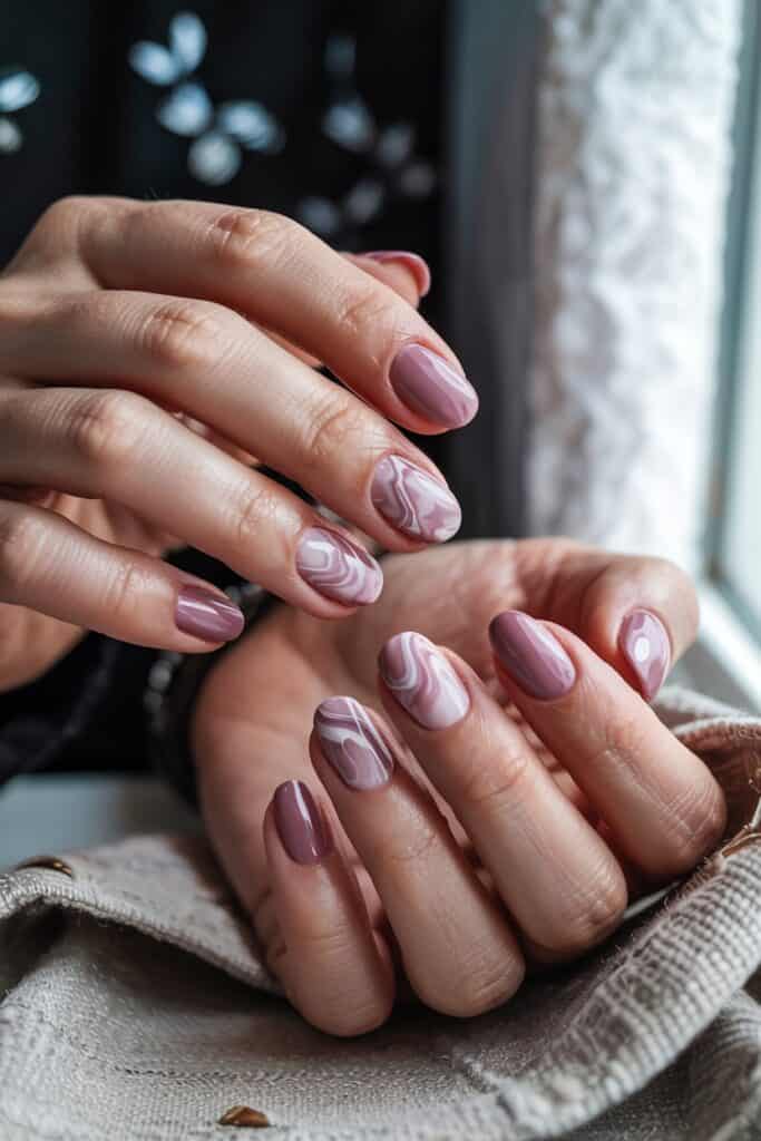 Swirl mauve pink with white and taupe for a marbled look. Each nail turns into a mini piece of art.