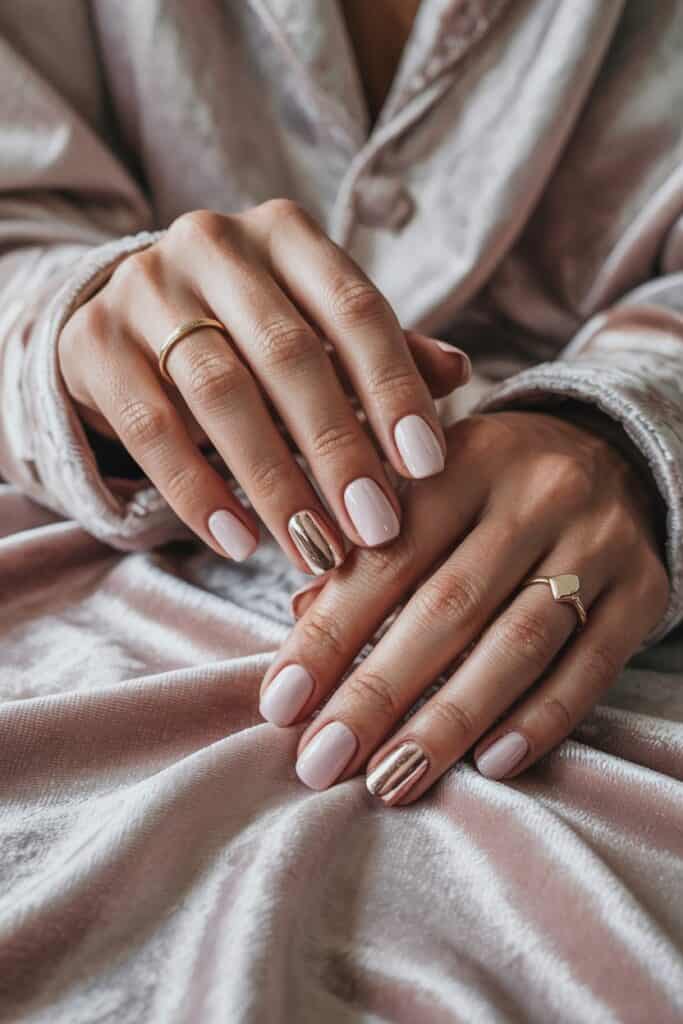 Pair soft pink polish with one or two rose gold chrome nails. The metallic finish adds a chic, autumn glow.